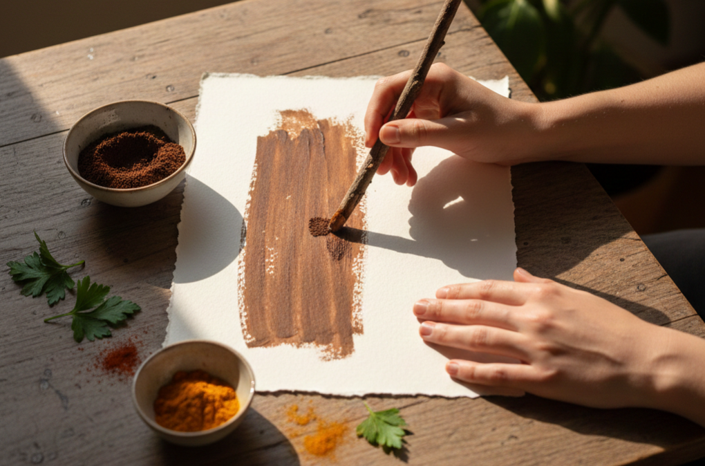 A Matéria como Apoio: Usamos elementos vivos — como o café, a salsa, pimentão ou outros materiais botânicos — porque a sua imperfeição orgânica valida a nossa própria humanidade e retira a pressão do "fazer bem".
