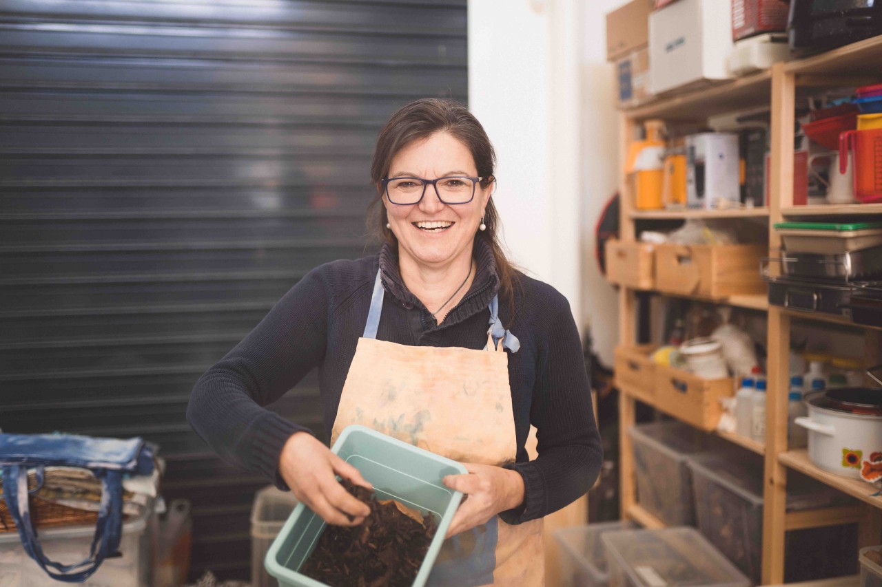 Através da sua marca Tinctória Natural, ela convida-@ a trocar a pressa pelo gesto e o ecrã pelo contacto profundo com a matéria orgânica.
